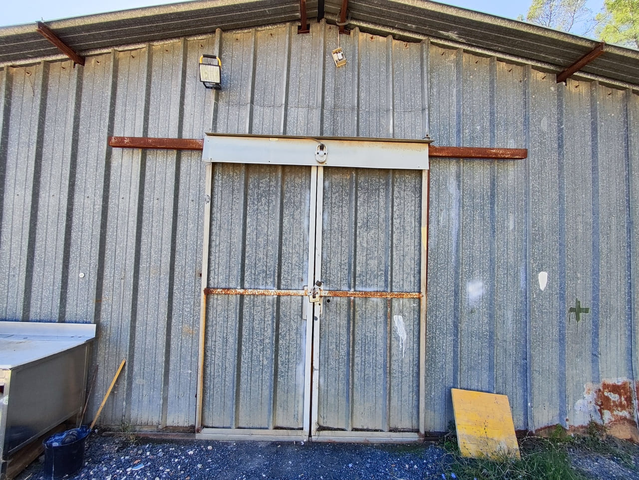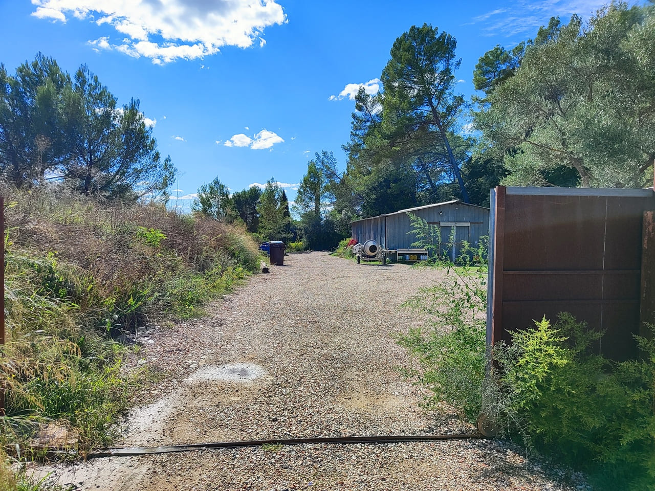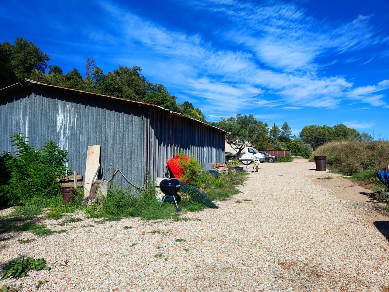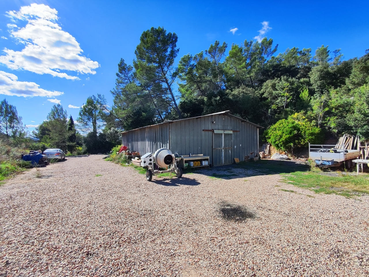 Ce hangar de 120 m² dispose d’un Permis de Construire délivré en 1988. Il est construit sur une dalle béton, comporte 3 faces métalliques, et 1 face en agglos. La toiture est également métallique.