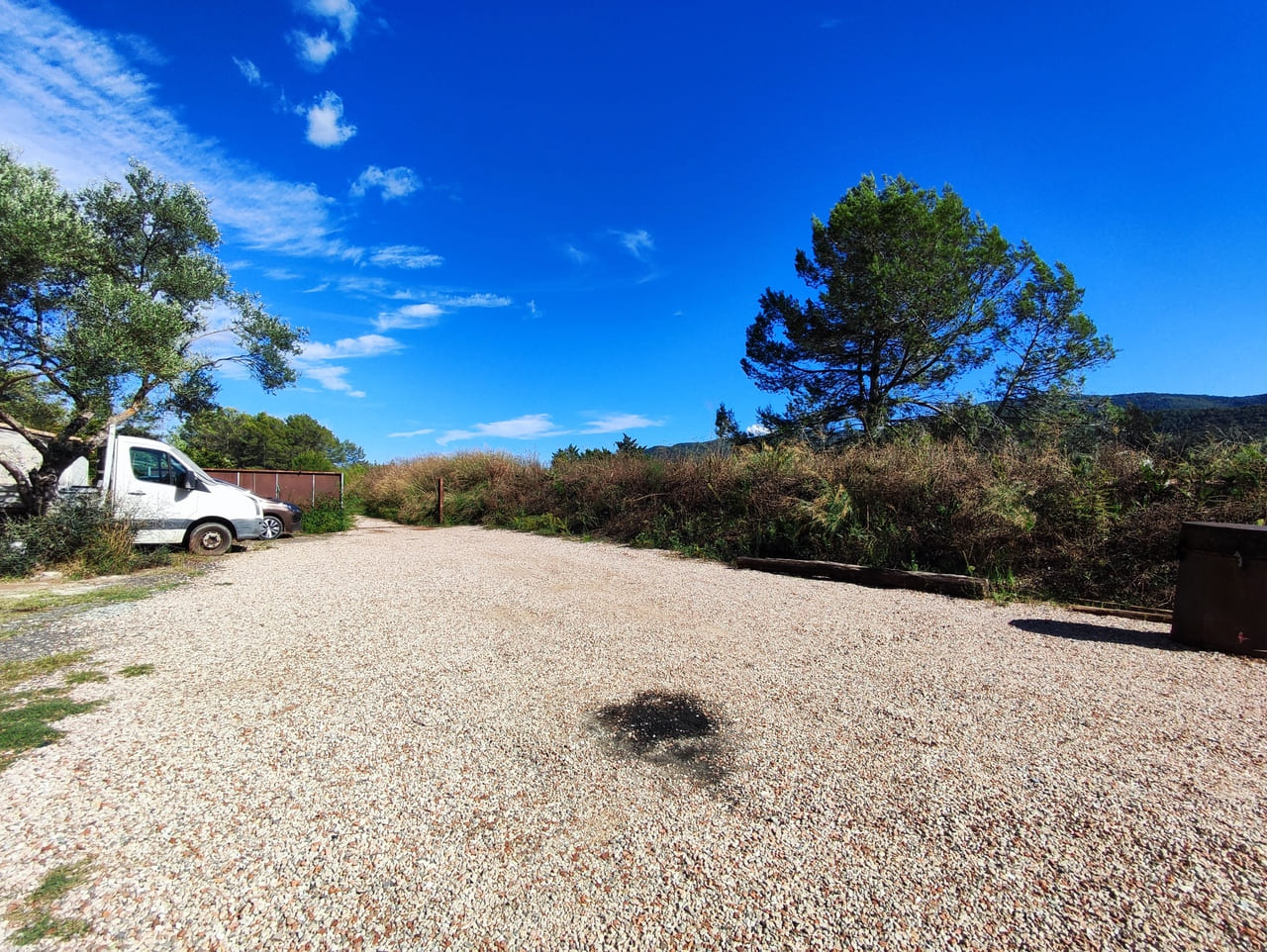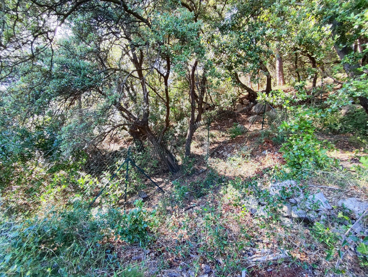 Le terrain est en partie plat, avec une aire de retournement, et le restant est en nature de colline boisée. Il est partiellement clôturé.